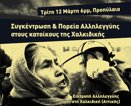 Καλεί τους πολίτες της Αθήνας την Τρίτη 12 Μαρτίου, στις 6.00 μ.μ. στα Προπύλαια στο μεγάλο Συλλαλητήριο συμπαράστασης στους αγωνιζόμενους πολίτες της Χαλκιδικής."